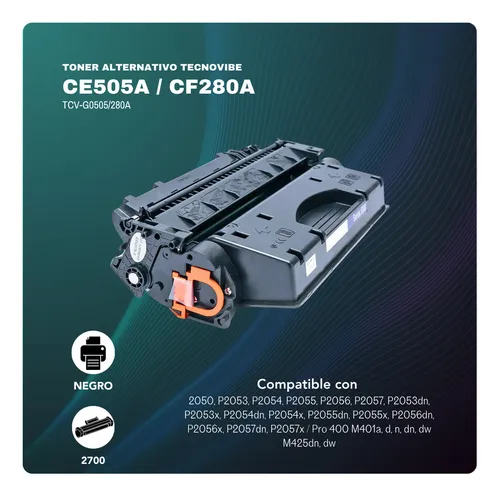 El cartucho de tóner HP CF280A / CE505A es la solución ideal para quienes buscan impresiones nítidas y profesionales. Compatible con impresoras HP LaserJet P2035, P2050, M400, M401 y M425, este tóner ofrece un rendimiento excepcional aproximado de 2,700 páginas, lo que lo convierte en una opción perfecta para oficinas con alta demanda de impresión.