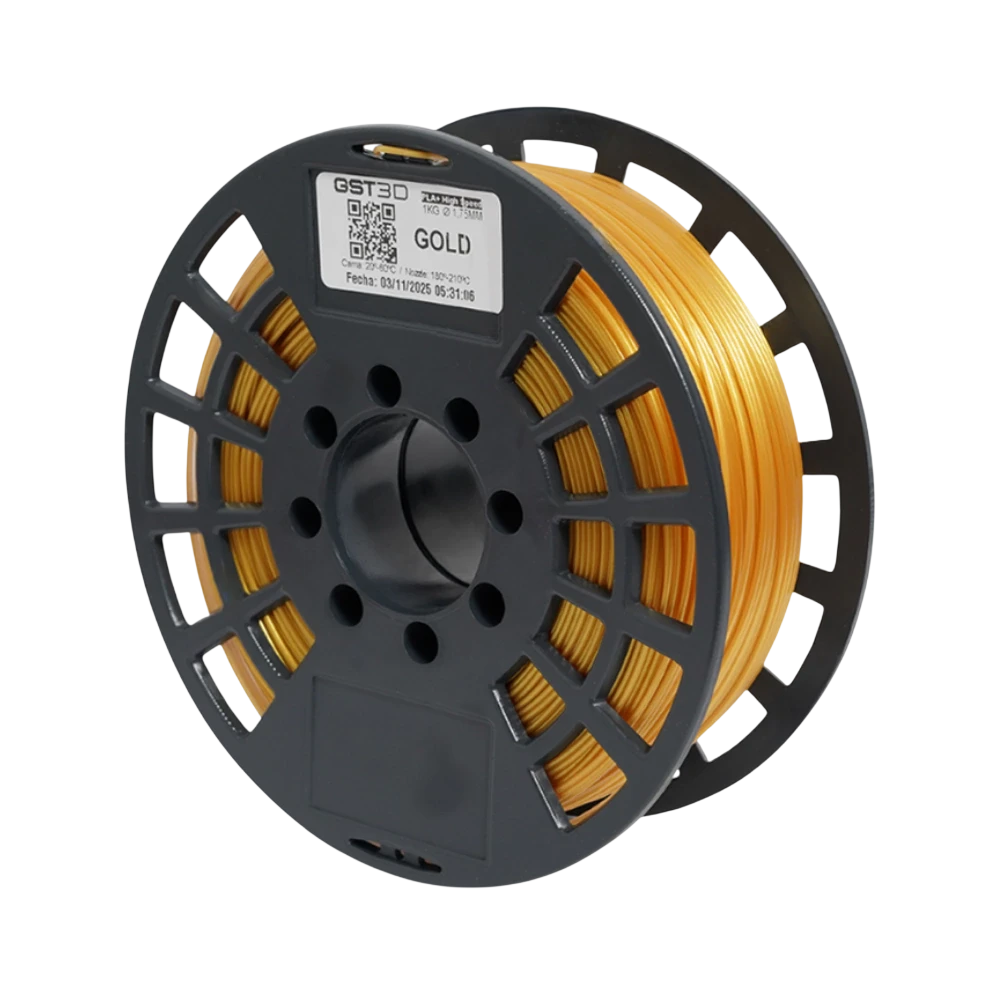 El Filamento PLA+ GST3D Gold 1kg en un vibrante color oro/dorado aporta un acabado lujoso y elegante que se destaca en cualquier proyecto de impresión 3D. Ideal para impresiones sofisticadas como copas del mundial o decoraciones elaboradas.