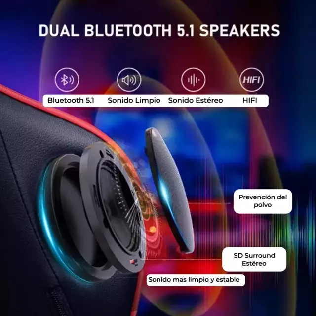 Luz LED RGB y parlantes integrados