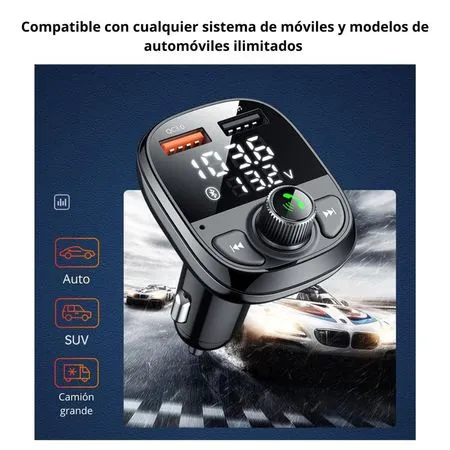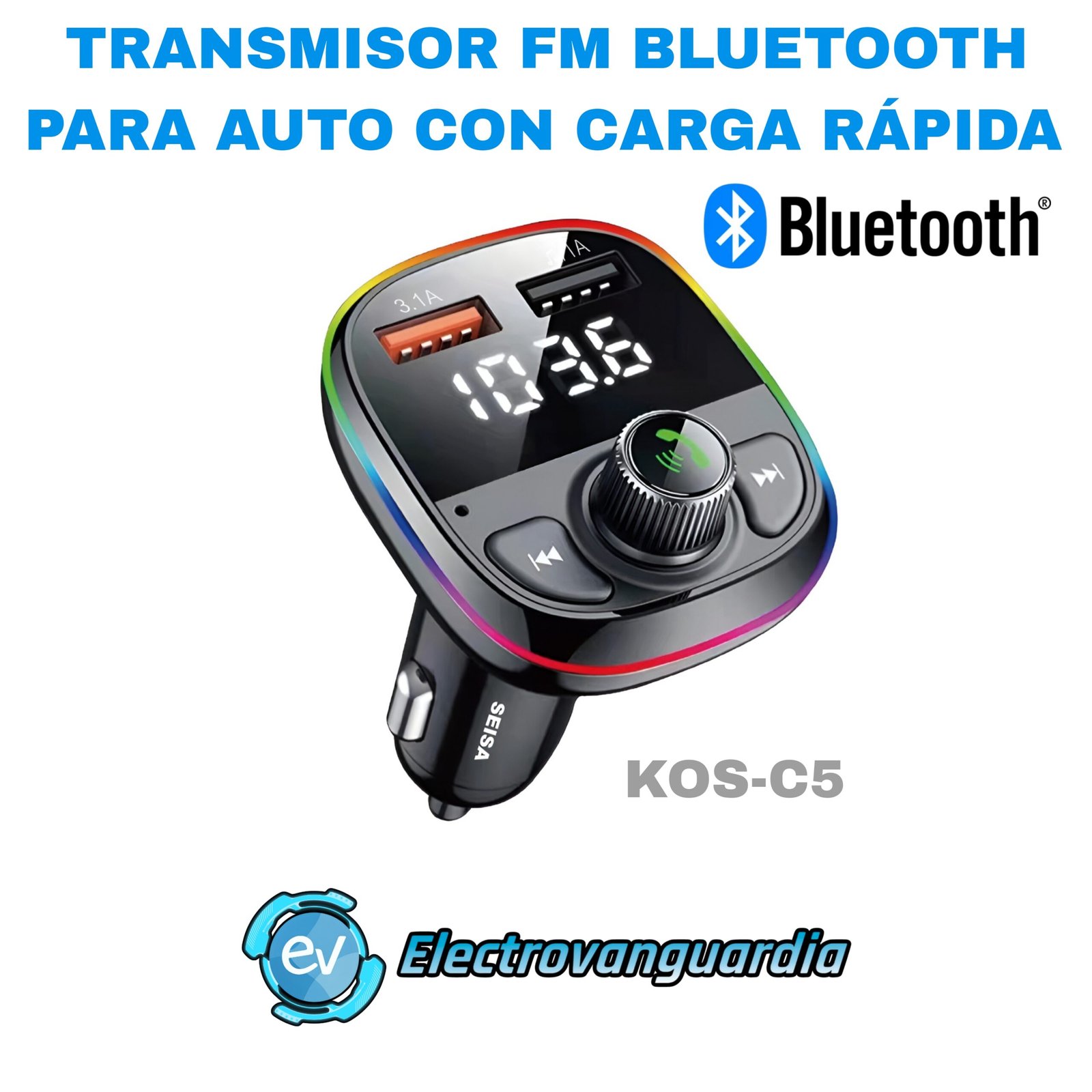 Transmisor Bluetooth para Auto con RGB y Doble USB Lleva tu experiencia de audio en el auto al siguiente nivel con este transmisor Bluetooth multifuncional. Diseñado especialmente para autorradios sin conexiones USB o AUX, te permitirá disfrutar de música y llamadas de forma inalámbrica directamente desde tu teléfono, tablet o iPad, usando la radio FM de tu vehículo. Su diseño compacto y versátil lo convierte en el accesorio perfecto para cualquier conductor. Características: Conectividad Bluetooth 5.0: Alta fidelidad de audio para una transmisión estable y sin interrupciones. Multifuncional: Reproduce música desde memorias USB, tarjetas Micro SD o directamente desde tu dispositivo móvil. Llamadas manos libres: Micrófono integrado para contestar llamadas con facilidad y seguridad al conducir. Pantalla LCD: Muestra información como frecuencia FM, estado de conexión y más. Iluminación RGB: Agrega un toque de estilo a tu auto con efectos de luz colorida. Doble USB: Incluye dos puertos USB con salida de 3.1A para cargar tus dispositivos mientras reproduces música. Alcance efectivo: Cobertura de hasta 5 metros para una conexión sin obstáculos. Alimentación práctica: Funciona con el conector de cigarrera del vehículo (12V-24V). Especificaciones técnicas: Modelo: C5 Protocolos USB: USB 2.0 Frecuencia compatible: 87,5 MHz – 108 MHz Rango de alimentación: 12-24V Formato de reproducción: Compatible con MP3 Este transmisor Bluetooth es la solución perfecta para transformar tu autorradio tradicional en un centro multimedia moderno, garantizando comodidad y estilo en cada trayecto.